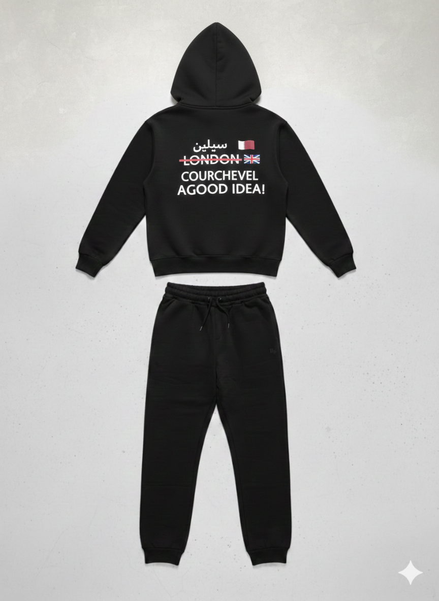 The hoodie features a clean, minimal front with the main attraction on the back: a high-definition screen print that strikes through "London" to reveal that Sealine (سيلين) is always the better idea. Complete with the Qatar and UK flags, this set is the ultimate conversation starter.